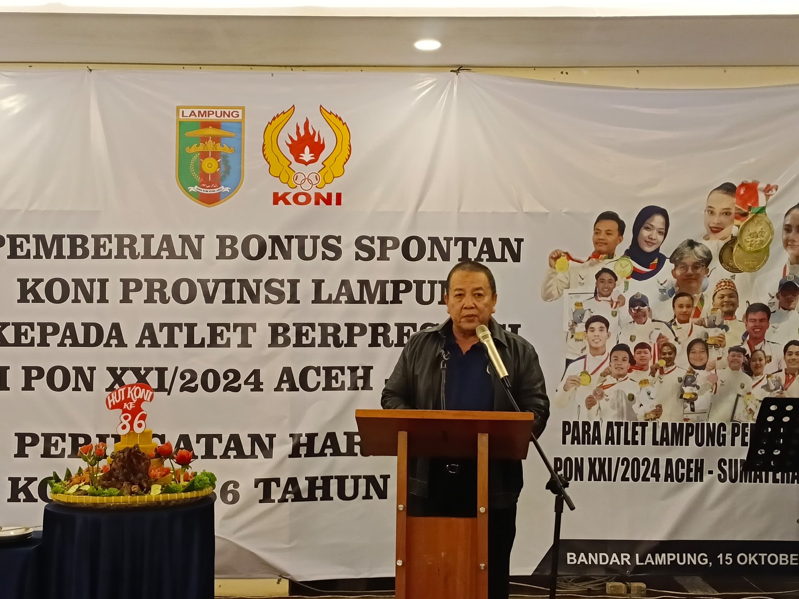 Hal itu disampaikan saat menghadiri kegiatan pemberian bonus spontan KONI Lampung kepada Atlet berprestasi di PON XX1/2024 Aceh, Sumatera Utara sekaligus peringatan hari jadi KONI ke-86Tahun 2024 yang barlangsung di Rumah Makan Kayu Jl. Arif Rahman Hakim, Jagabaya III L, Way Halim, Bandar Lampung Selasa (15/10/24) Malam