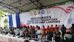 Bandar Lampung – Badan Narkotika Nasional Provinsi (BNNP) Lampung memusnahkan barang bukti narkotika jenis sabu dan ganja hasil pengungkapan sejumlah kasus sepanjang tahun 2025. Pemusnahan berlangsung pada Selasa, 18 November 2025, di Lapangan Panggung Satuan Polisi Pamong Praja Pemprov Lampung.