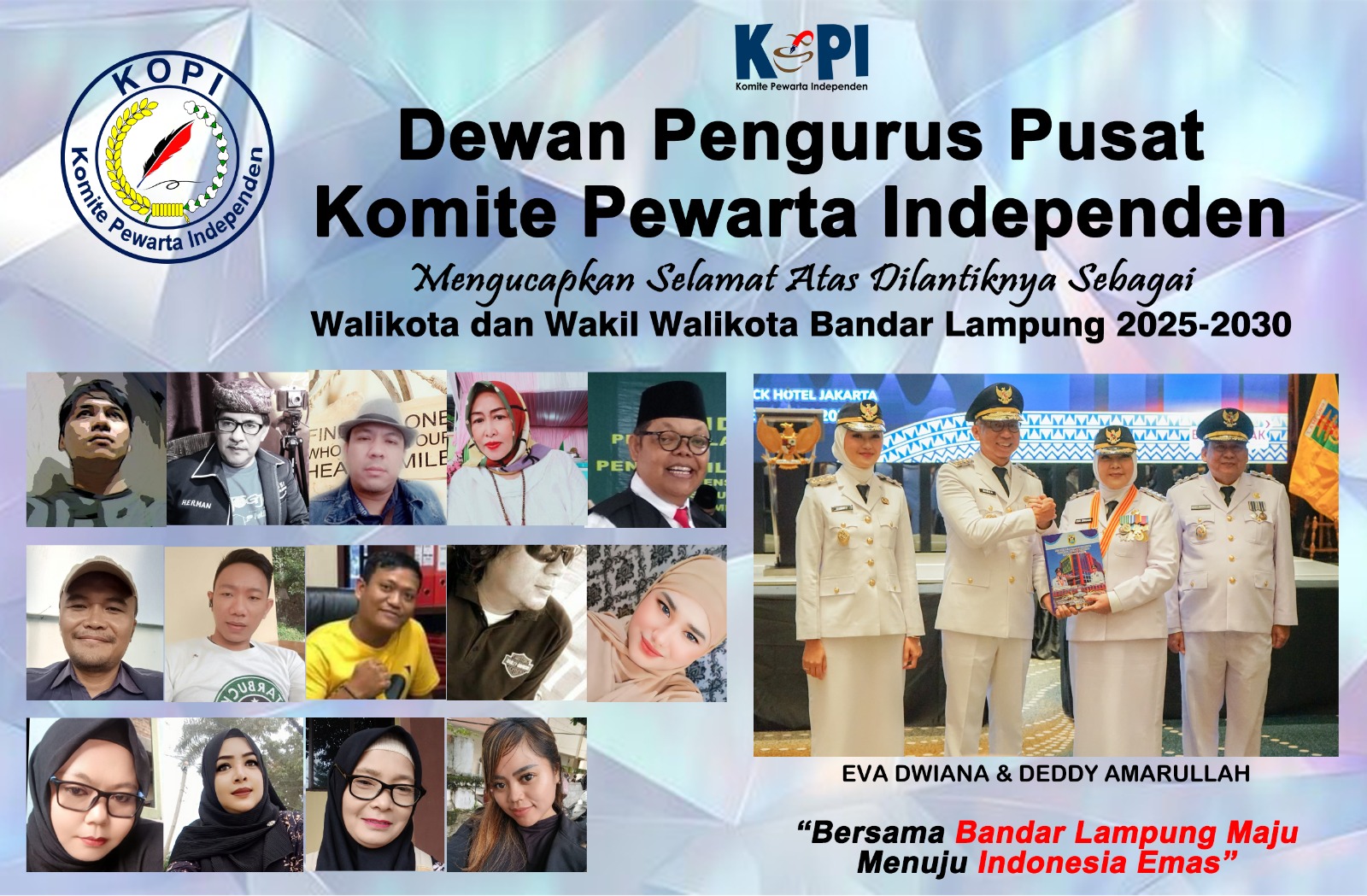 BENSORINFO.COM – Dewan Pimpinan Pusat Komite Pewarta Independen (DPP KoPI) mengucapkan selamat kepada  Eva Dwiana Dan Deddy Amarulah Sebagai Walikota dan Wakil Walikota terpilih periode 2025-2030 yang telah resmi dilantik oleh Presiden Prabowo Subianto di Istana Negara, Kamis, 20/02/2025.(Red)
