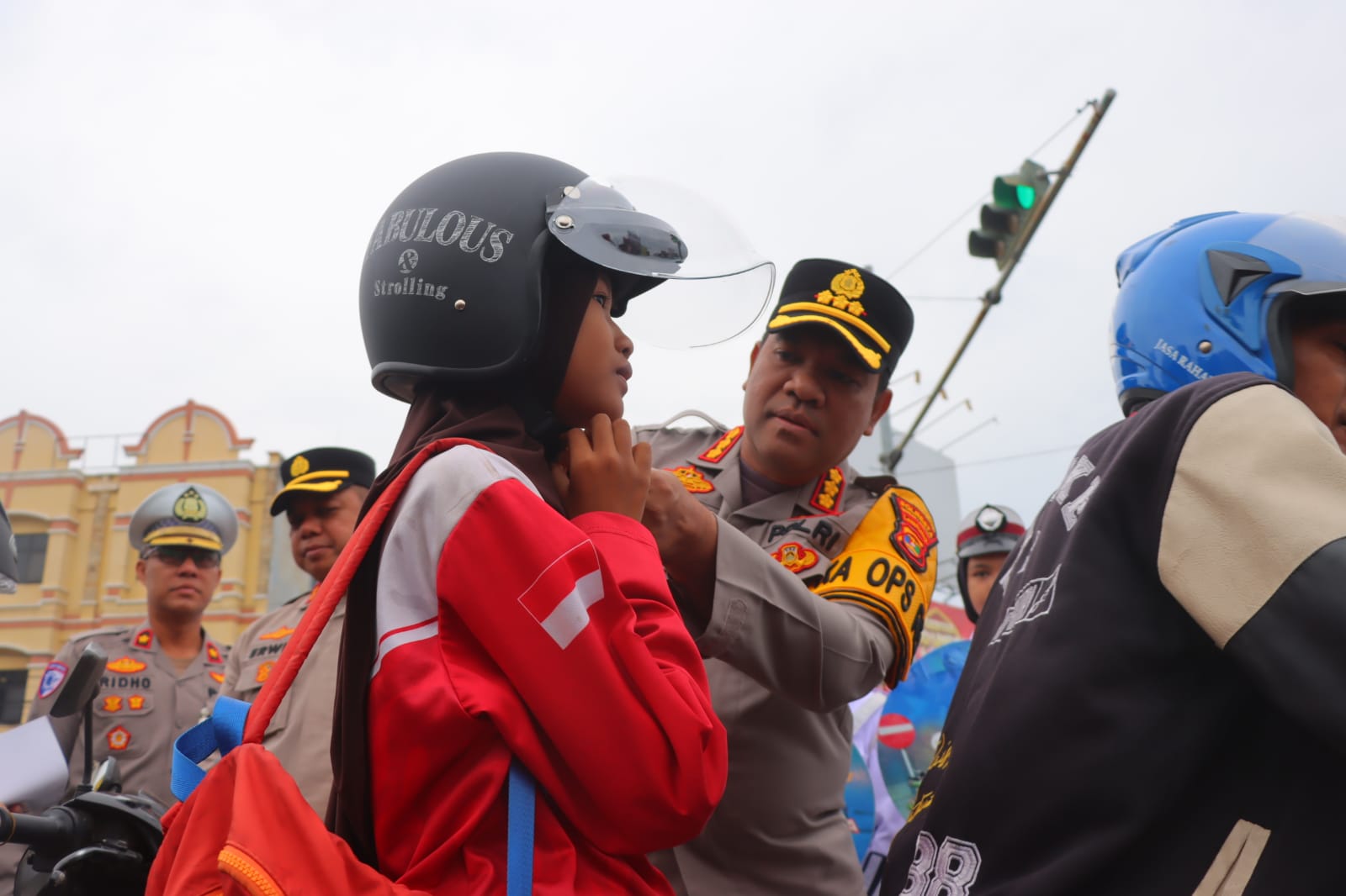 Foto : Kapolresta Bandar Lampung, Kombes Pol Alfret Jacob Tilukay saat menyematkan helm pada salah satu pengendara motor yang tertib