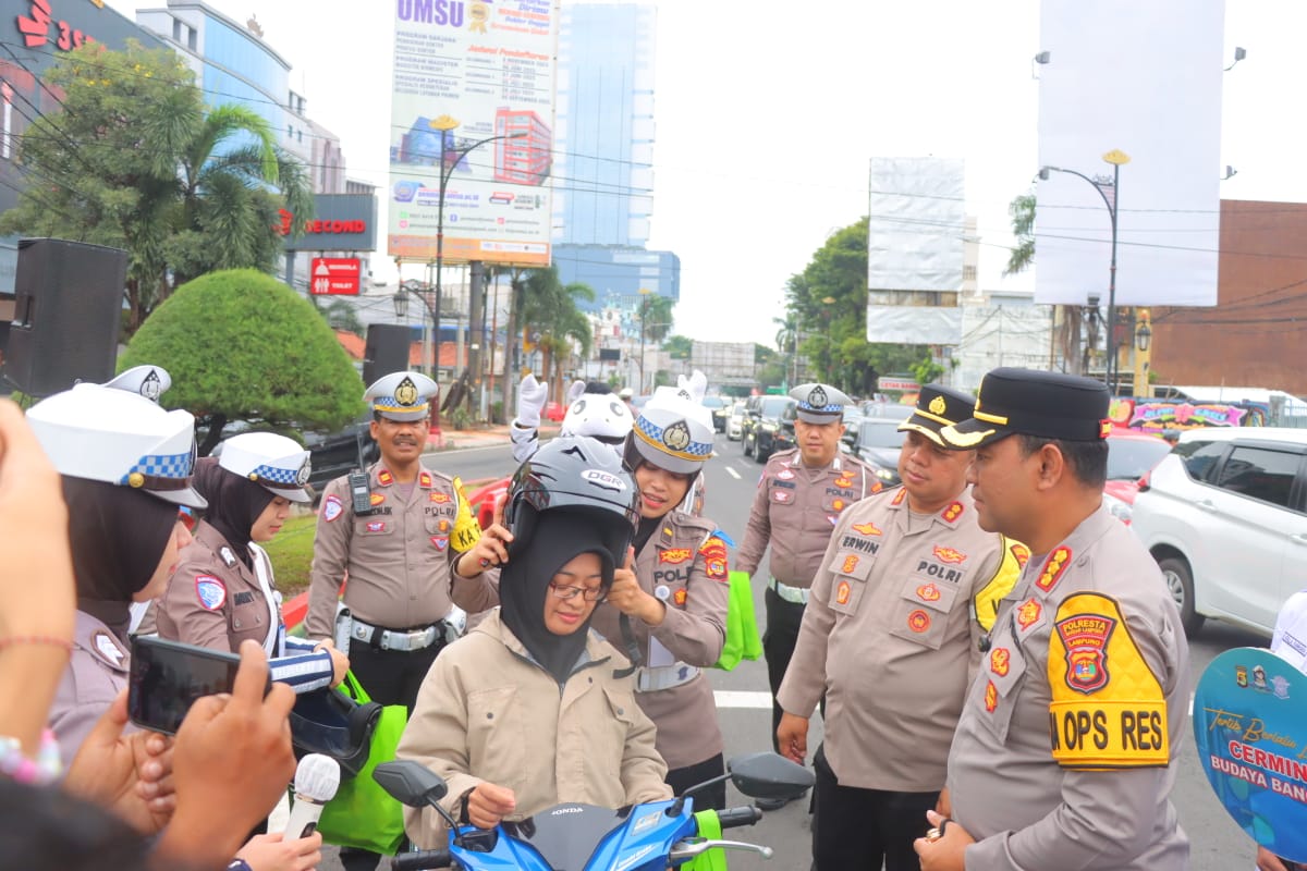 Gebyar Ops Keselamatan 2025: Polisi Bagikan Helm dan Bingkisan untuk Pengendara Tertib di Bandar Lampung