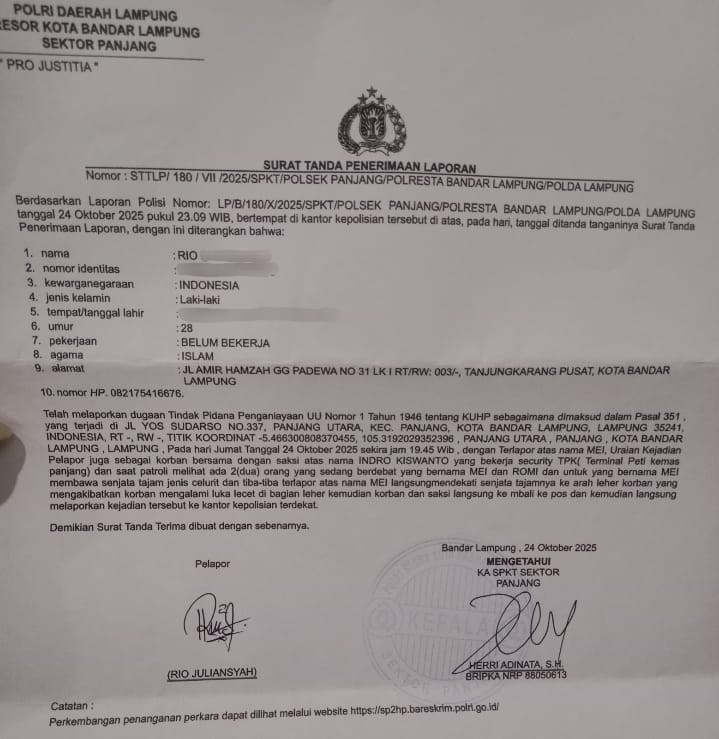 Atas insiden itu, korban melapor ke Polsek Panjang dengan nomor laporan LP/B.180/VII/2025/SPKT/Polsek Panjang/Polresta Bandar Lampung, tertanggal 24 Oktober 2025.