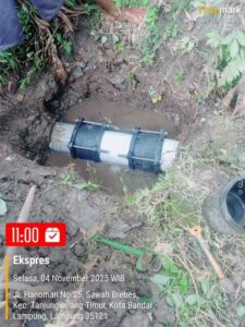 Keterangan Foto : Ketua RT 005 LK I Kelurahan Sawah Brebes, Kecamatan Tanjung Karang Timur, Arifin Indra Jaya, S.Sos, saat mengecek genangan air pasca hujan.