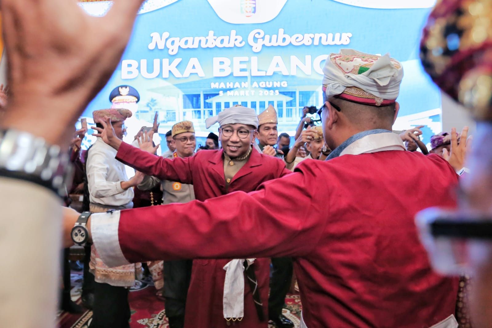 BENSORINFO.COM – Pemerintah Provinsi Lampung bersama Majelis Penyimbang Adat Lampung (MPAL) menggelar Tradisi Adat bertajuk “Ngantak Gubernur Buka Belangan”, yang menghantar Gubernur Rahmat Mirzani Djausal dan Ibu Purnama Wulan Sari Mirza menuju Mahan Agung, Bandar Lampung, Rabu (5/3/2025) sore.